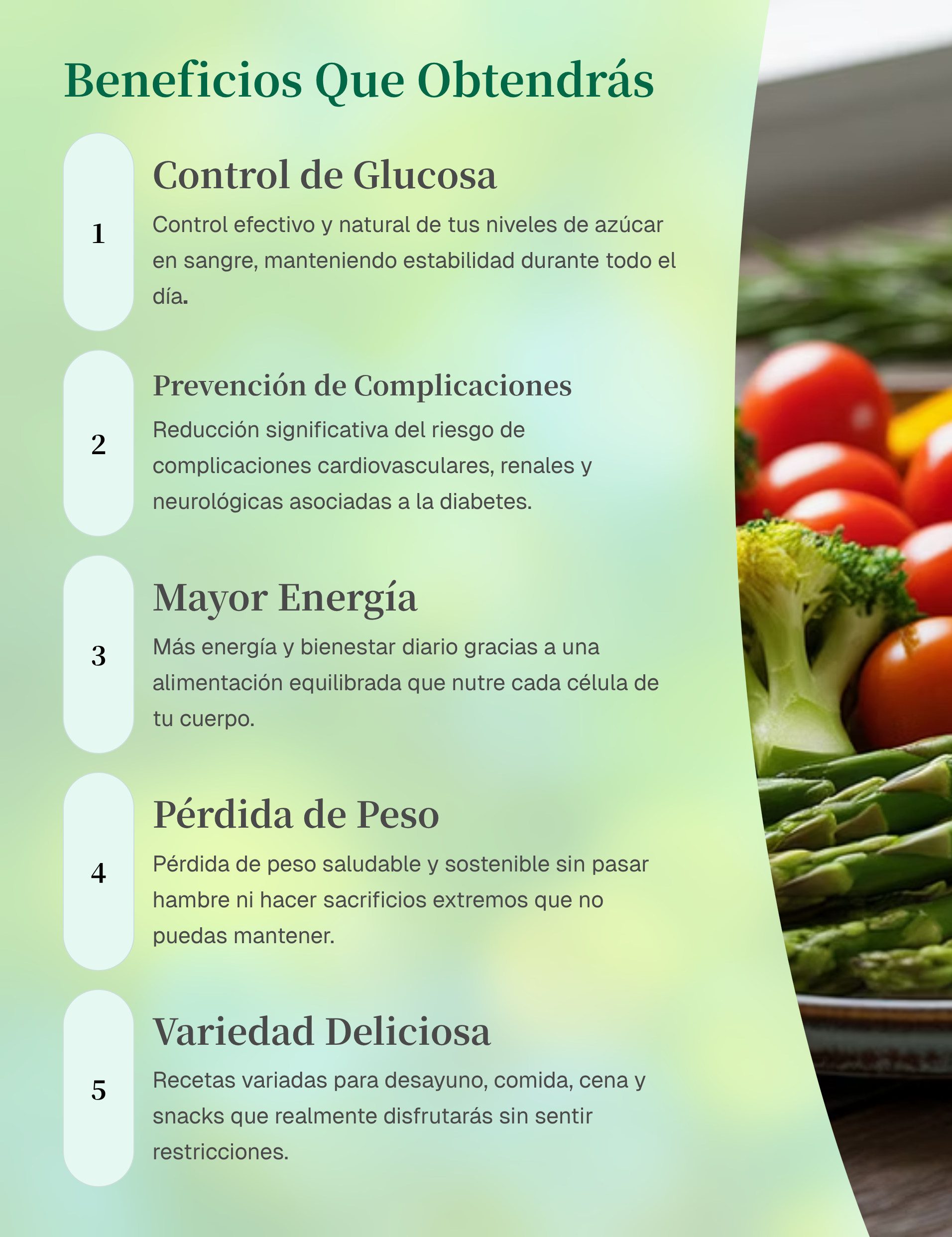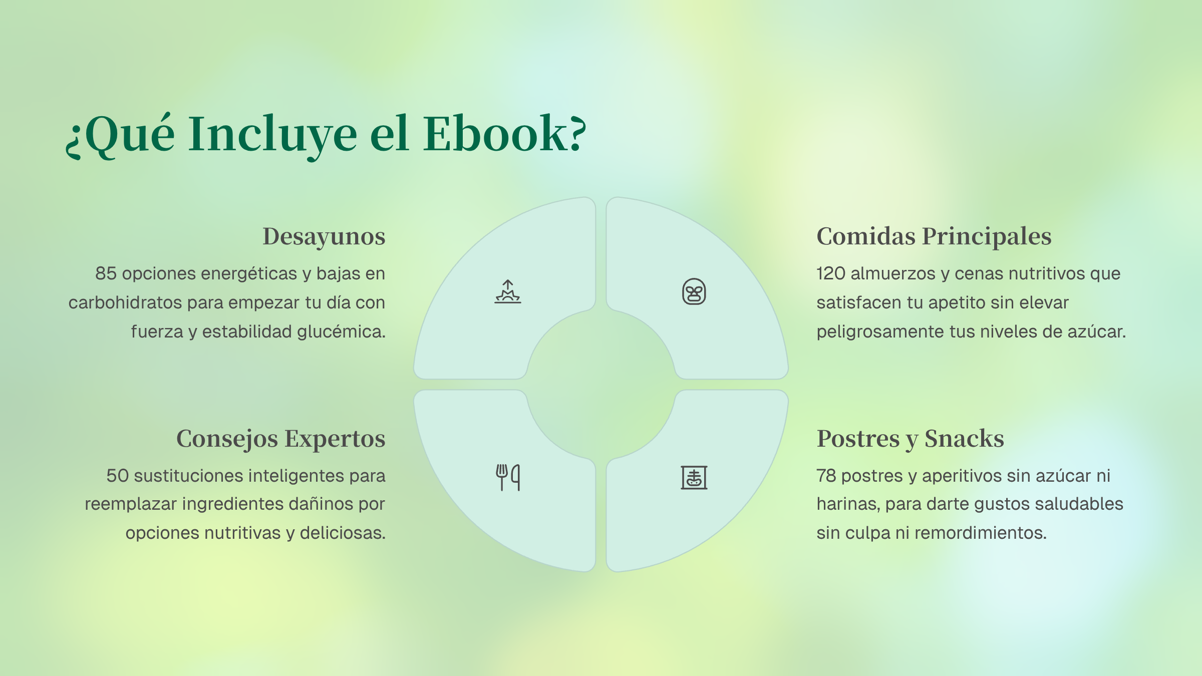 El eBook incluye variedad: desayunos, almuerzos, cenas, snacks y postres aptos para diabéticos, con alternativas más saludables y deliciosas.