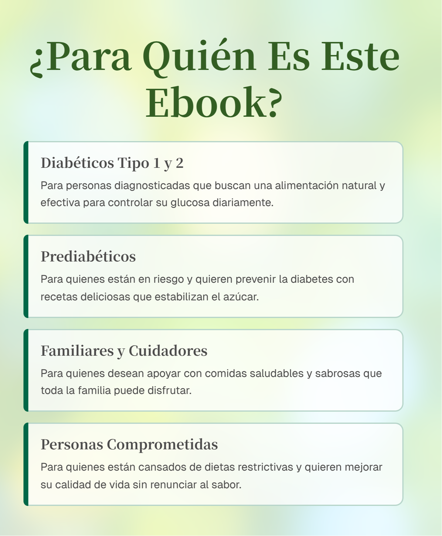 El recetario está pensado principalmente para apoyar a personas con diabetes tipo 2, pero muchas recetas pueden ser útiles también para quienes buscan cuidar sus niveles de glucosa y mantener una alimentación saludable.